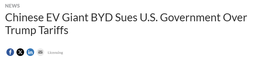 比亚迪多家美国本土子公司(包括从事乘用车、公交车以及动力电池业务的实体)已向联邦政府的广泛关税政策提起诉讼。特朗普总统于去年4月实施该关税措施。