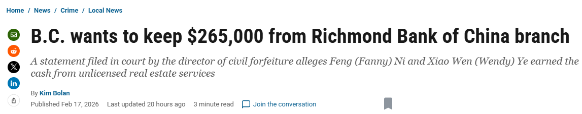 FX168财经报社(北美)讯 加拿大不列颠哥伦比亚省(简称BC省)监管机构在10年前冻结了位于列治文(Richmond)中国银行(Bank of China)分行的一个账户,该账户被指与非法房地产交易有关。如今,BC省政府希望将账户内26.5万加元存款及其利息予以没收。