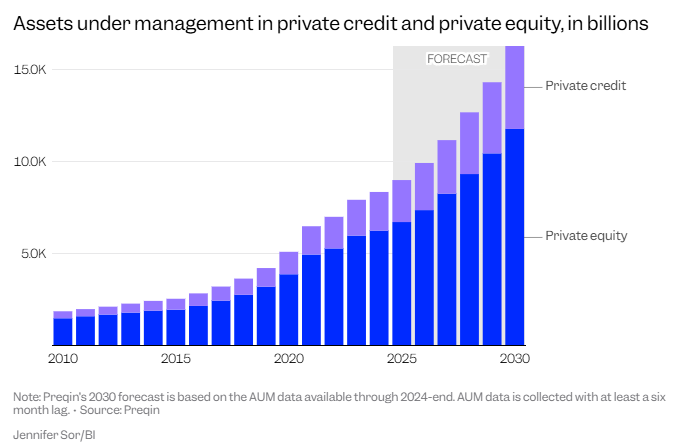 El-Erian的担忧落在一个现实背景之上:近年来巨量资金持续涌入私募市场。Business Insider援引Preqin数据称,私募信贷资产管理规模已升至约2.2万亿美元,较五年前增长约86%。