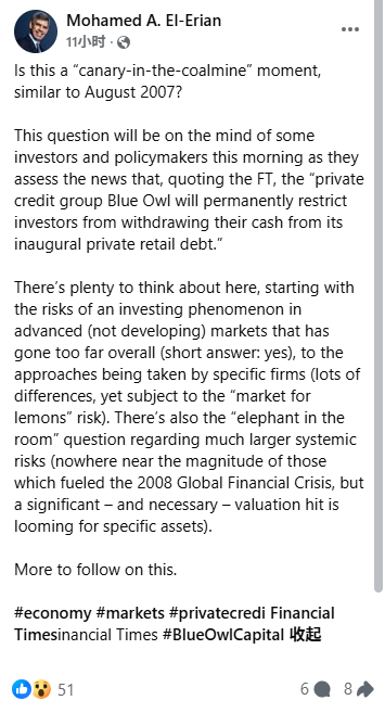 安联首席经济顾问、前PIMCO首席执行官Mohamed El-Erian周四在LinkedIn发文称,Blue Owl的这一变化让他想起金融危机前夕的某些“回声”,并提出关键问题:这是否是类似2007年8月的“煤矿里的金丝雀”时刻?