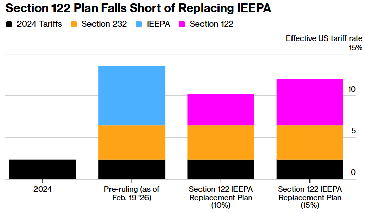 根据彭博经济研究的分析,考虑这些豁免后,美国的平均有效关税税率将稳定在约10.2%,低于法院裁决前的13.6%。若全球统一税率提高至15%,有效税率约为12%。