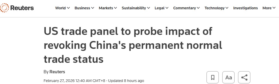 FX168财经报社(亚太)讯 英国路透社周五(2月27日)报道称,美国国际贸易委员会(USITC)周四表示,将就取消中国“永久正常贸易关系”(PNTR)地位在未来六年内可能带来的经济影响展开调查。此举可能会提高对中国进口商品征收的关税。