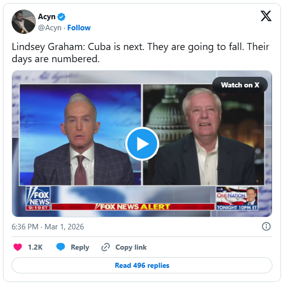 FX168财经报社(北美)讯 在美以对伊朗发动联合空袭并引发中东地区大规模冲突后,共和党参议员林赛·格雷厄姆表示,特朗普总统“下一步将是古巴”。