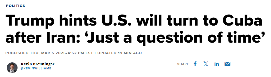 FX168财经报社(北美)讯 美国总统特朗普周四(3月5日)暗示,在美国对伊朗的军事行动结束后,其政府可能将外交与安全政策的关注点转向古巴。