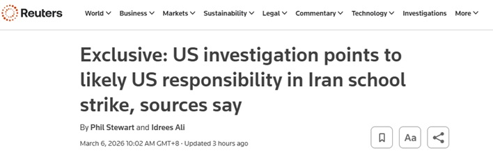 FX168财经报社(亚太)讯 英国路透社周五(3月6日)发布独家报道称,两名美国官员告诉路透社,美国军方调查人员认为,美方可能对上周六发生的伊朗女子学校袭击事件负责,但他们尚未得出最终结论,也未完成调查。该次袭击造成数十名儿童死亡。
