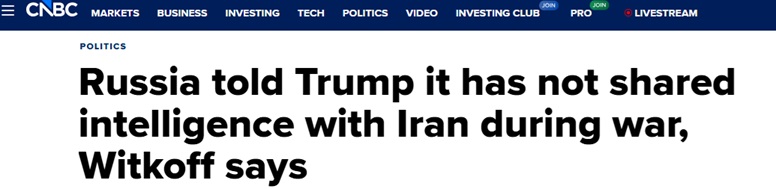 威特科夫声称,在那次通话中,乌沙科夫“重申了同样的说法”,即俄罗斯没有与伊朗分享情报。