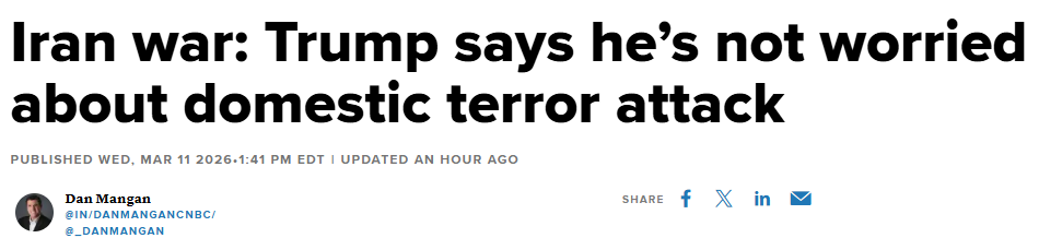 FX168财经报社(北美)讯 美国总统唐纳德·特朗普周三(3月11日)表示,他并不担心伊朗会为了报复美国和以色列正在进行的战争而在美国本土发动恐怖袭击。