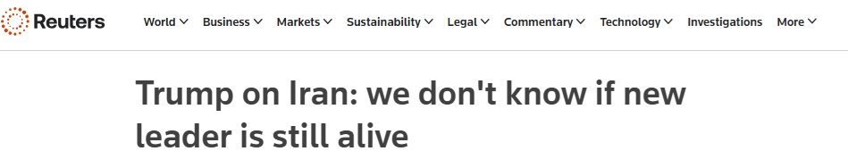 FX168财经报社(亚太)讯 美国总统特朗普(Donald Trump)当地时间周一(3月16日)表示,鉴于有报道称伊朗新任领导人在一次空袭中受伤,目前尚不清楚伊朗新领导人——阿亚图拉·穆杰塔巴·哈梅内伊(Ayatollah Mojtaba Khamenei)是否仍然活着。