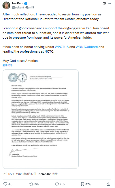 FX168财经报社(北美)讯 美国国家反恐中心(NCTC)主任乔·肯特周二(3月17日)宣布辞职,以抗议特朗普政府针对伊朗的战争行动。肯特在发布于个人X账号的致总统特朗普公开信中表示,他“无法凭良心继续支持这场正在进行的战争”。