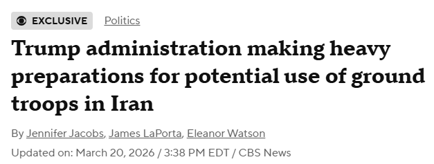 FX168财经报社(北美)讯 多家媒体周五(3月20日)援引知情人士报道称,五角大楼已就向伊朗部署美国地面部队制定了详细准备方案,美军高层也已提交相关具体请求,以便在总统特朗普权衡美以对伊冲突下一步行动时,为白宫保留更多军事选项。尽管特朗普前一天在白宫公开称“不会向任何地方派兵”,但又补充说“如果真要派,也不会告诉你”。与此同时,美国正持续向中东调动更多兵力,包括第82空降师相关力量、海军陆战队远征部队以及新的两栖舰和战舰部署。