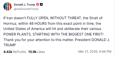 特朗普周六(3月21日)晚在社交媒体上表示,如果伊朗未在48小时内开放该海峡,他将“打击并彻底摧毁”伊朗的发电厂,并将从规模最大的电厂开始。