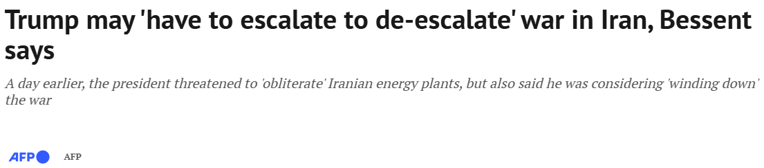 FX168财经报社(北美)讯 美国财政部长斯科特·贝森特周日(3月22日)表示,美国若要实现对伊朗战争的“收缩”目标,可能反而需要先进一步升级打击力度。此前,美国总统特朗普接连释放彼此矛盾的战争信号,使外界对华盛顿下一步战略走向愈发困惑。