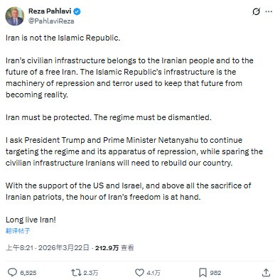 与此同时,伊朗末代国王巴列维的流亡之子礼萨·巴列维也在周日发声,呼吁特朗普和以色列总理内塔尼亚胡不要攻击伊朗的民用基础设施。他表示,这些设施“属于伊朗人民,也属于一个自由伊朗的未来”。