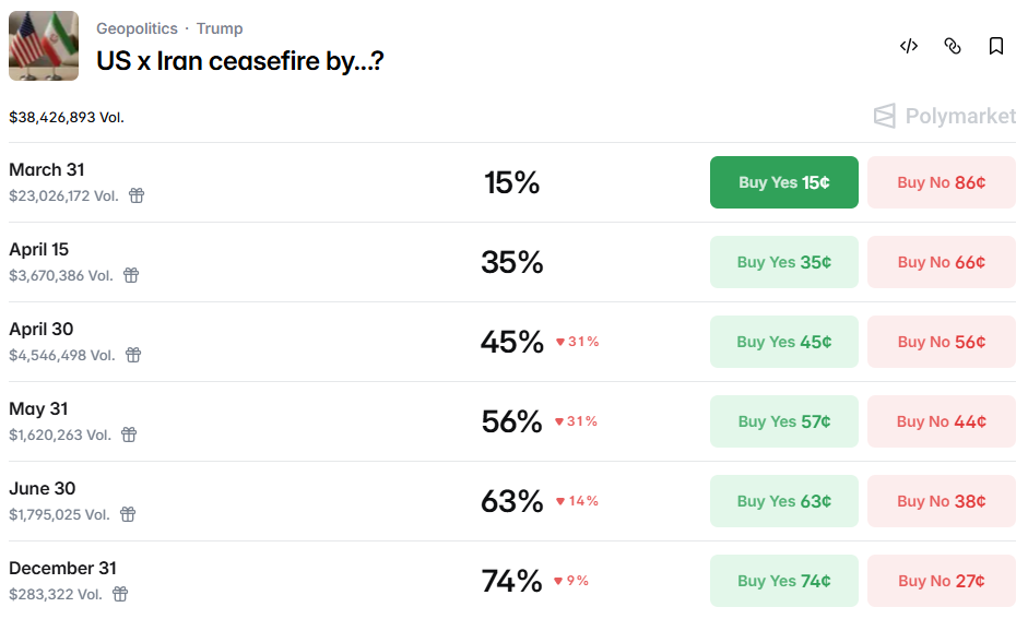 与此同时,Polymarket平台上“3月31日前停火”的隐含概率也在短时间内显著上升。根据报道,这一结果的市场定价已从3月21日的6%升至周一的24%,相关市场总押注金额超过2100万美元,显示大量资金正在围绕停火预期快速重新布局。