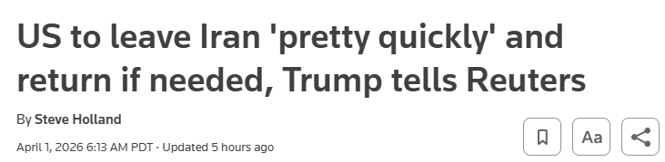 FX168财经报社(北美)讯 美国总统特朗普周三(4月1日)在接受路透社采访时表示,美国将“相当快”撤出伊朗,但如果有需要,未来仍可能对伊朗实施“点状打击”。