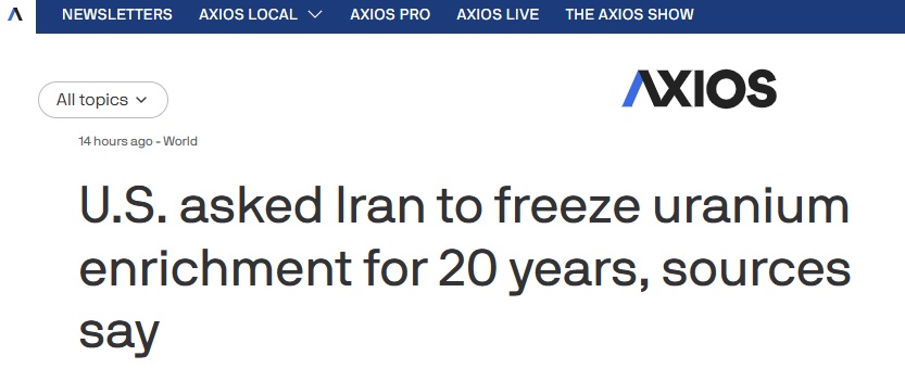 幕后情况:Axios称,美国要求暂停铀浓缩是周末马拉松式谈判中的关键问题。一位知情人士称:“美国建议至少暂停20年,同时附加各种其他限制。”