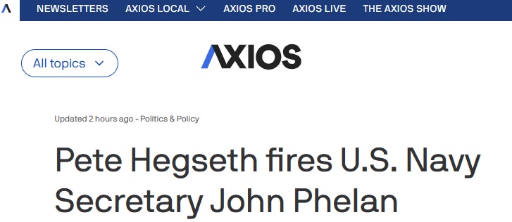 FX168财经报社(亚太)讯 美国新闻网站Axios周三(4月22日)报道称,美国国防部长皮特·赫格塞斯(Pete Hegseth)解雇了海军部长约翰·菲兰(John Phelan)。五角大楼在周三将此事描述为“立即生效的离职”。