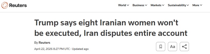 FX168财经报社(亚太)讯 英国路透社周三(4月22日)报道称,美国总统特朗普(Donald Trump)周三表示,伊朗已同意不处决八名女性抗议者,以示对他的尊重;然而,德黑兰官员否认曾计划执行这些处决,并指责特朗普散布虚假信息。