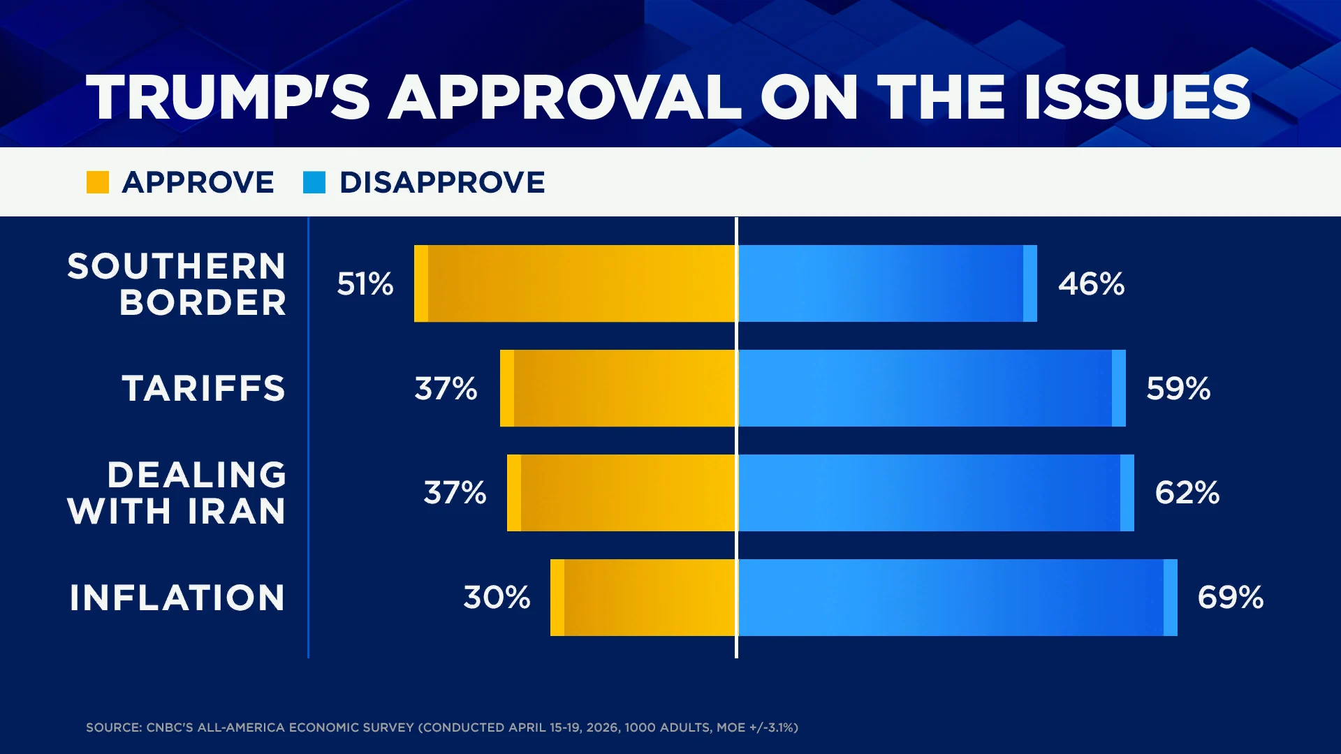 FX168财经报社(北美)讯 美国总统特朗普的整体支持率以及经济支持率在最新一轮CNBC“全美经济调查”中显著下降,这一变化在很大程度上反映出美国民众对伊朗战争、高油价以及经济前景的广泛不满。