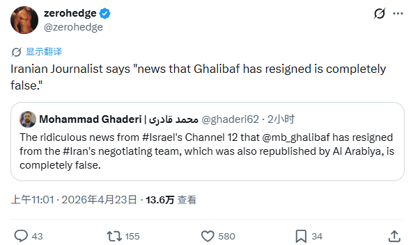 此前有报道称,伊朗议会议长加利巴夫可能已退出谈判团队,甚至一度出现有关其遭到控制的未经证实传言。但最新更新显示,一名伊朗记者表示,这一消息并不属实。