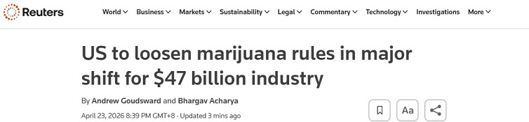 FX168财经报社(亚太)讯 英国路透社周五(4月24日)报道称,美国司法部周四表示,将立即放宽对部分大麻产品的限制,并迅速推动将其重新分类为危险性较低的药物,这是美国数十年来最大规模的毒品政策调整之一。