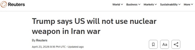 FX168财经报社(亚太)讯 英国路透社周四(4月23日)报道称,美国总统特朗普(Donald Trump)周四表示,他不会在针对伊朗的战争中使用核武器。