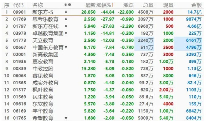 从香港股市的教育股来看,新东方一度暴跌50%,蒸发了400多亿,创造历史最大单日跌幅,思考乐教育一度跌近30%,卓越教育集团一度跌超16%。