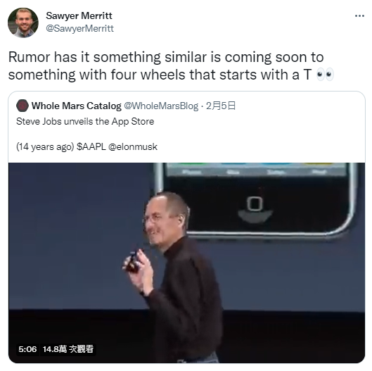 FX168财经报社(香港)讯 知名特斯拉(Tesla)狂热投资人索耶·梅里特(Sawyer Merritt)提到,以T开头美国“四轮”品牌,正积极研发自家APP应用商店,似乎剑指苹果的Apple Store商店。而在推文中,还贴上已故苹果前首席执行官贾伯斯(Steve Jobs)的视频。