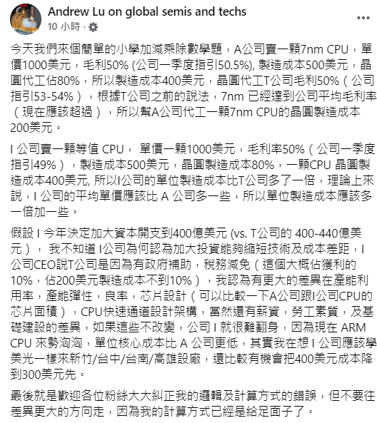 “I公司卖一颗等值CPU,单价一颗1000美元,毛利率50%(公司一季度指引49%),制造成本500美元,晶圆制造成本80%,一颗CPU晶圆制造成本400美元,所以I公司的单位制造成本比T公司多了一倍,理论上来说,I公司的平均单价应该比A公司多一些,所以单位制造成本应该多一倍加一些。”他继续写道。