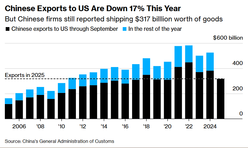 尽管中国出口展现出韧性,但美中贸易总体上正在缩减。特朗普正推动美国制造业回流,将关键产业本土化。今年中国对美出口总额已降至不足 3200 亿美元,接近 2017 年第一次贸易战前的水平。