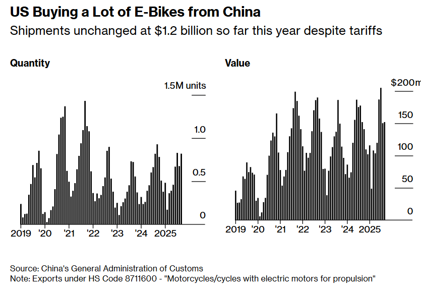 中美两大经济体的联系不仅局限于中国主导的稀土、化工原料等领域。数据显示,美国今年仍大量购买来自中国的电动自行车,尽管关税高企,出口额仍保持在12亿美元左右。