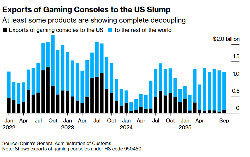 例如,游戏机出口大幅下滑——任天堂和微软等公司已将生产转移至越南等地以规避高关税。美国消费者购买电视的来源也发生变化,中国对美出口LCD电视的金额上季度暴跌 73%。