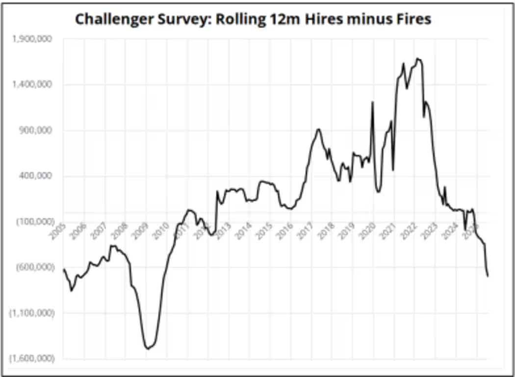 周四公布的Challenger、Gray和Christmas数据为近期令人失望的就业市场数据增添了新的亮点,就像投资者连续第二个月错过劳工部的官方就业数据一样。这似乎加剧了人们长期以来对股市估值过高、投机行业泡沫以及对人工智能行业持久性的怀疑的担忧。
