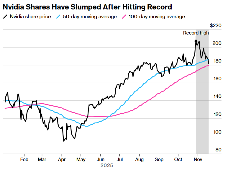 (英伟达股价自创纪录高位回落 来源:彭博)