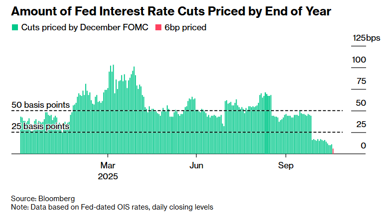 由于政策制定者发表鹰派言论、政府数据缺失,交易员已逐渐削减对12月降息的押注。货币市场目前仅定价约 30% 的降息几率。