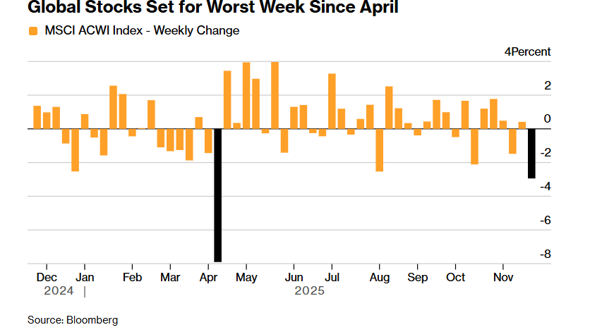 MSCI 全球指数本周已下跌近 3%,或录得自 4 月 4 日以来最大周跌幅——当时特朗普总统的关税措施曾引发市场震荡。周五(11月21日)亚洲股市下跌 1.6%,同样走向自 4 月以来最弱的一周,此前华尔街主要指数在周四普遍回落。加密货币也持续承压,比特币跌破 86,000 美元。