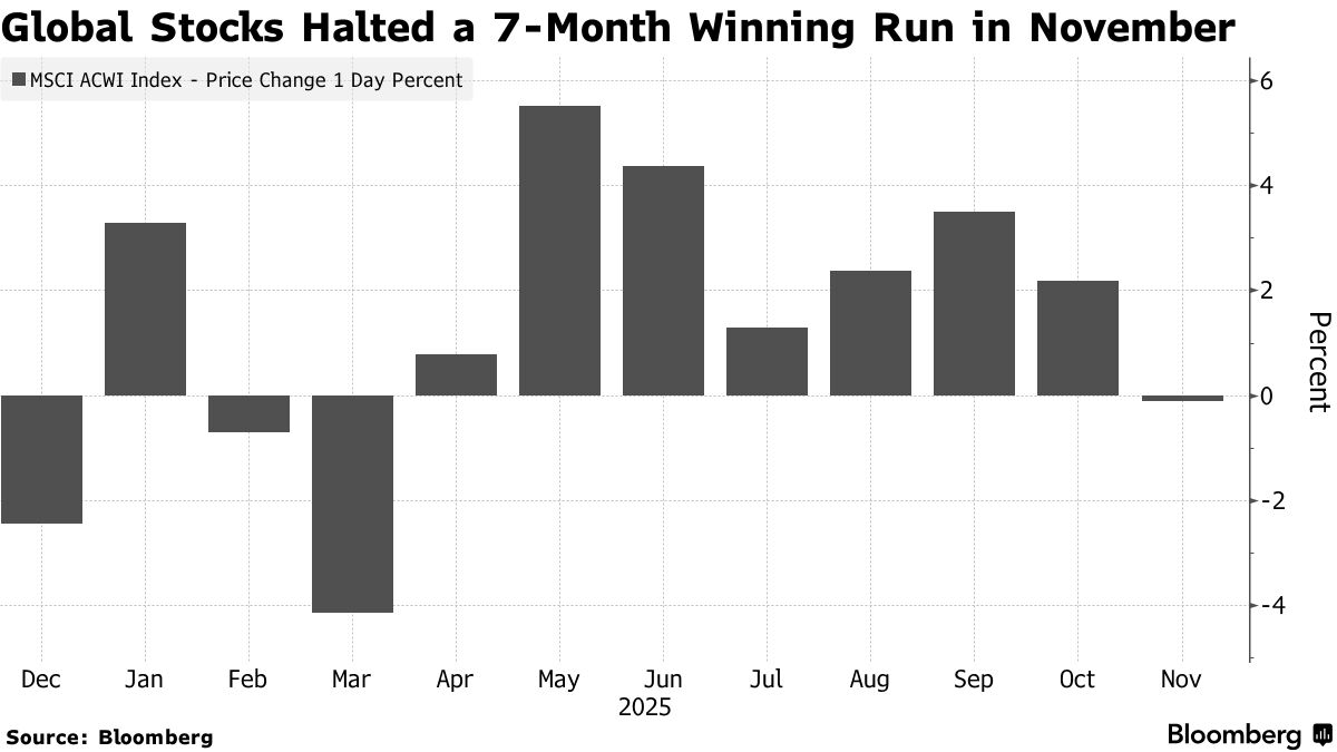 MSCI全球股票指数在连续七个月上涨后,11 月下跌 0.1%。随着市场对 AI 概念股高估值和高投入的担忧升温,涨势被迫中断。彭博统计显示,该指数过去十年在 12 月平均上涨 0.5%。