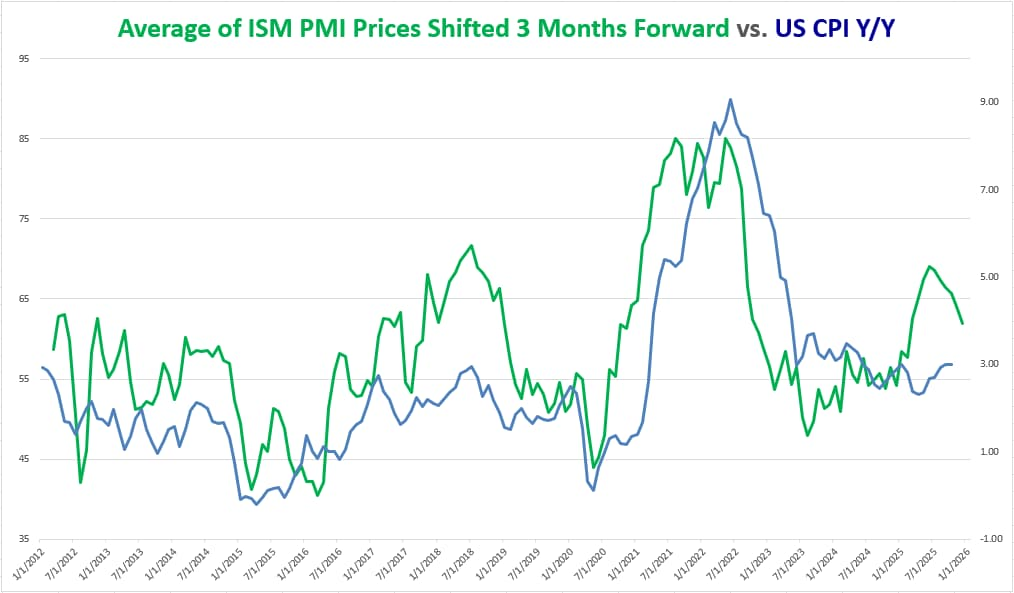 从上图可以看到,PMI 报告中的“价格”分项指标近几个月已开始回落,但实际通胀水平仍低于这些指标在历史上所暗示的水平。这表明,在可预见的未来,通胀数据大幅跌破 3.0% 的空间可能相当有限。