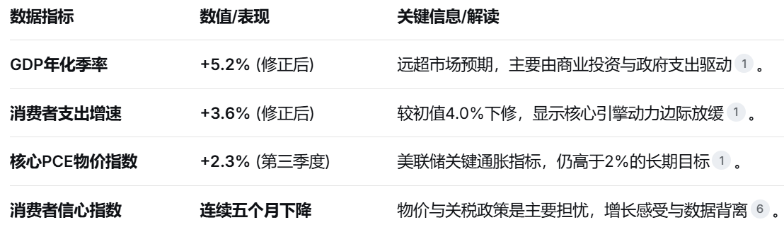 根据美国商务部经济分析局的数据,2025年第三季度,美国实际国内生产总值按年化季率终值增长5.2%,显著高于此前4.9%的初值。这一超预期的上修主要得益于商业投资(特别是设备与知识产权投资)和政府支出的强劲表现。