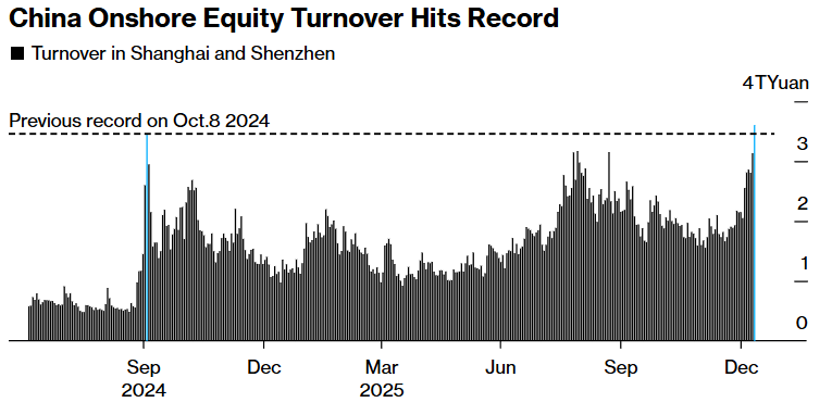 FX168财经报社(亚太)讯 周一(1月12日)沪深两市成交额创历史新高,达到3.6万亿元人民币(约5160亿美元),显示中国股市的“动物精神”(风险偏好与投机情绪)持续升温。
