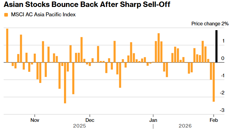 FX168财经报社(亚太)讯 周二(2月3日)亚洲股市从逾两个月来最惨烈的抛售中反弹。在周一剧烈波动后,黄金与白银回升帮助市场企稳,同时科技股走强,带动风险偏好回暖。