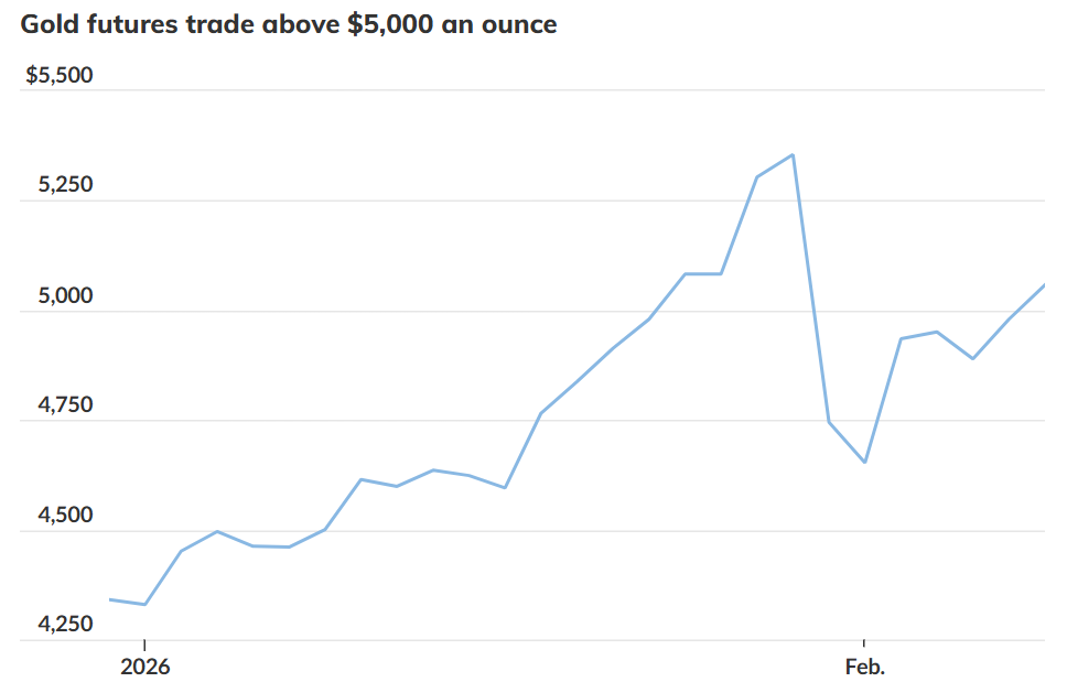 周一(2月9日)黄金期货上涨,部分原因是美元下跌并逼近四年低位,黄金价格在超过一周以来首次收盘站上5,000 美元上方。与此同时,围绕美联储独立性的疑虑升温、全球央行持续买入黄金,以及海外不确定性,共同支撑了金价走强。