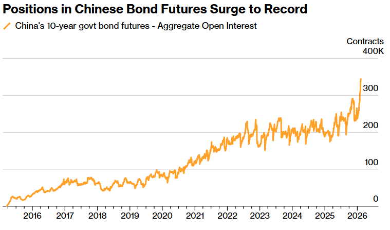 交易所数据显示,与中国10年期国债挂钩的国债期货未平仓合约数量周一(2月9日)升至 344,171手,为该品种自 2015 年上市以来最高水平。该数据较年初增长 46%,不仅显著高于 2025 年全年约 24% 的增幅,也显示参与度在加速上升。