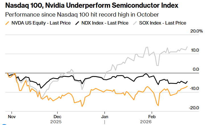 (纳斯达克100与英伟达跑输半导体指数 来源:彭博)
