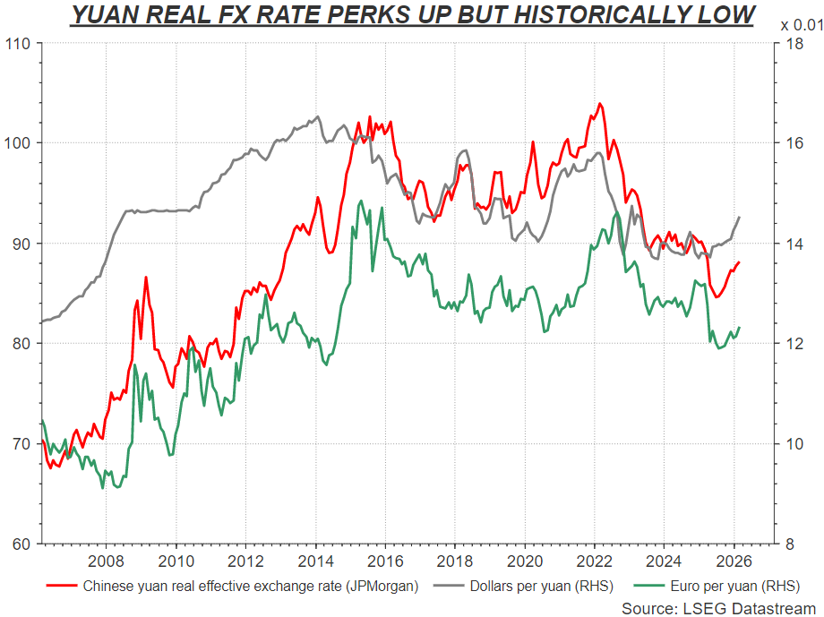 换个角度看:人民币对一篮子贸易加权货币的实际有效汇率(REER)过去一年有所回升,但仍比四年前低16%。
