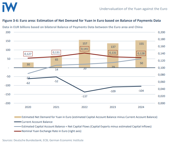 马特斯更进一步指出,显著的汇率操纵很可能是重要原因。他援引国民账户与证券投资流数据,认为2020年至2024年期间应当出现约1,250亿欧元的人民币需求,但并未在汇率上体现出来。
