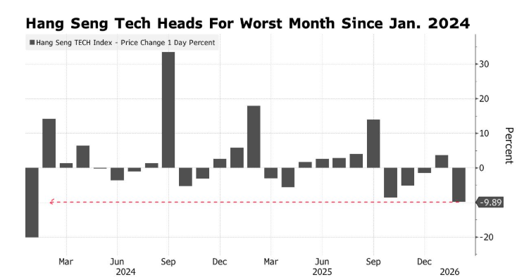 恒生科技指数2月累计下跌10%,有望录得自2024年1月以来的最大月度跌幅。该指数目前已深陷熊市区间——相较于10月高点,累计回撤接近23%。