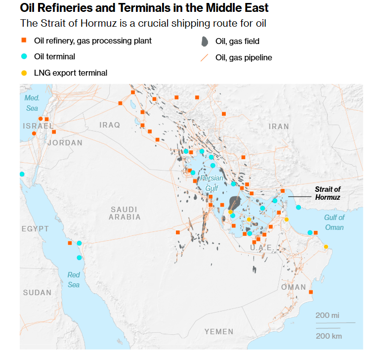 伊朗供应约占全球石油的5%。彭博经济研究的Ziad Daoud与Dina Esfandiary在亚洲开盘前发布的报告称,若伊朗原油供应完全中断,油价可能大涨约20%。他们还警告,全球约20%的石油供应需要经由霍尔木兹海峡运输;如果该海峡被关闭,油价可能飙升至每桶108美元。