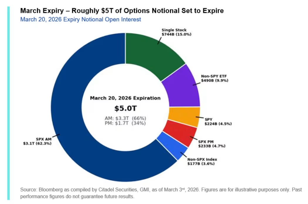 这段“金融行话”的意思是:Rubner 预计股市最终会走高。不过,他的看多逻辑很大程度上取决于 3 月的期权到期日——3 月 20 日。根据Citadel的数据,本次季度“三巫日(Triple Witching)”可能会成为史上规模最大的之一。