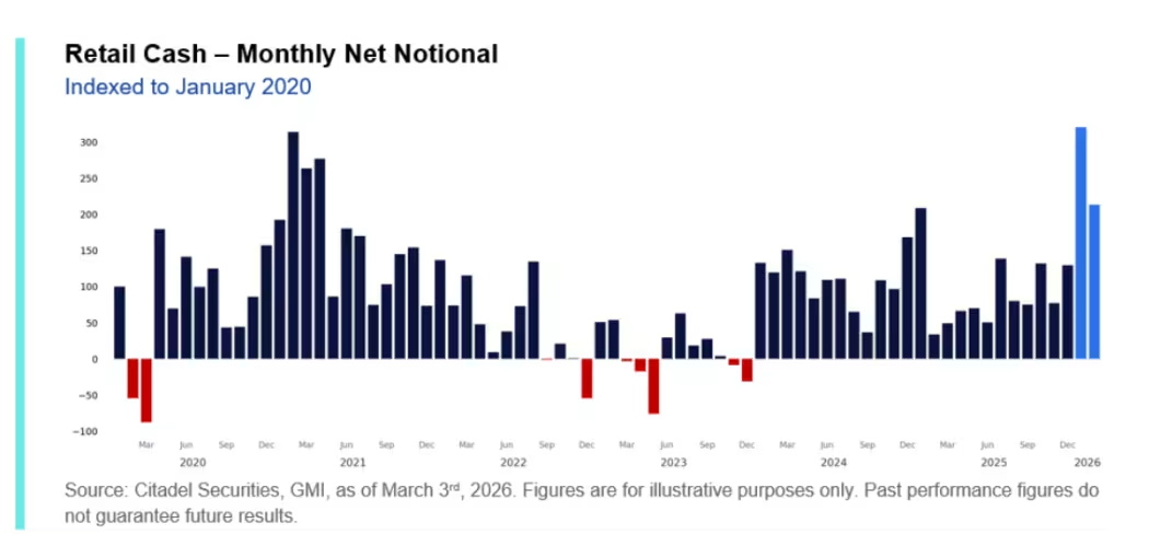 Citadel的图表显示,散户参与度在 2026 年初对市场健康的作用,与 2025 年同样关键。